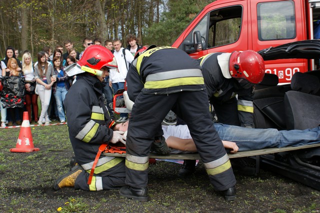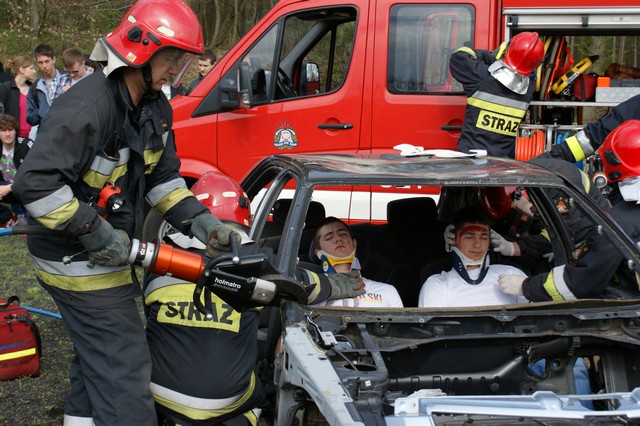 Strażacy tego dnia nie mieli chwili wytchnienia. Zaraz po ewakuacji przedstawili pokaz akcji ratunkowej poszkodowanym w wypadku samochodowym. Jako pozoranci w pokazie udział wzięli również nasi uczniowie z klasy II TOŚ/TG. Strażacy zademonstrowali w jaki sposób wyciąga się osoby zakleszczone w samochodzie, poprzez rozcinanie karoserii specjalnymi nożycami hydraulicznymi, a następnie udzielili im pierwszej pomocy. No koniec uczniowie mogli podziwiać akcję gaszenia wraku wcześniej pociętego samochodu. Za te pokazy i ewakuację Strażacy otrzymali zasłużone brawa i wyrazy uznania.
