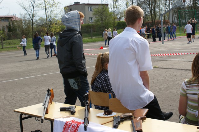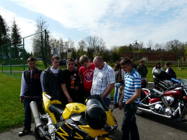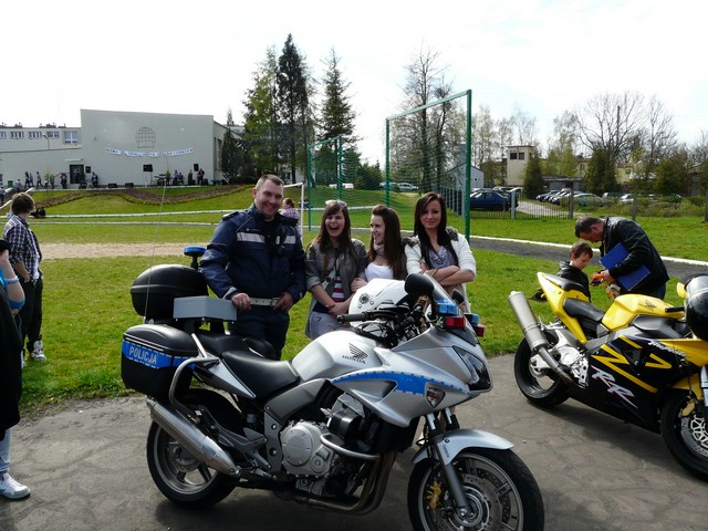 Dużym zainteresowaniem ciszyło się również stanowisko Klubu Motocyklowego, połączone z stanowiskiem Komendy Policji. Policję reprezentował zmotoryzowany policjant- sierżant sztabowy Robert Dąbkowski, zaproszony przez panią Agnieszkę Płotkowską (nauczycielkę przysposobienia obronnego w naszej szkole).